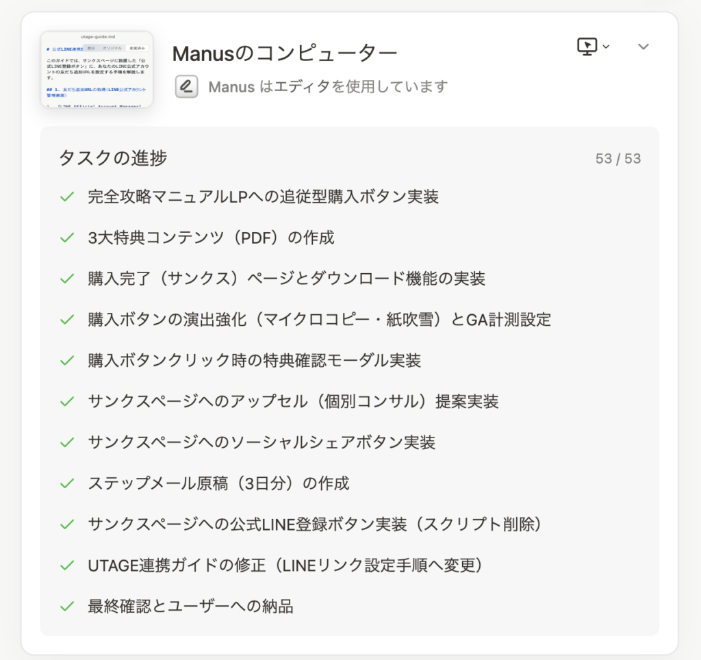 Manusは、一つの指示から膨大なサブタスクを自動生成し、一つずつ確実に「完了」のチェックを入れていきます。今回使ってみてその数、実に60ものタスクに及びました。