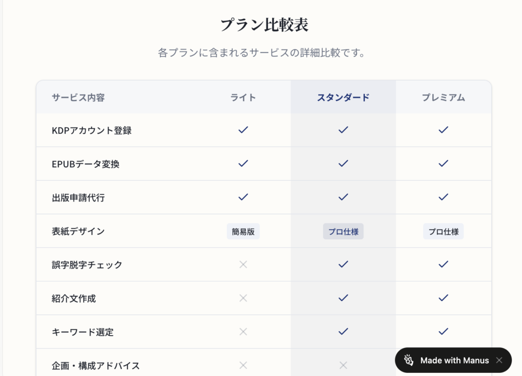 ライト、スタンダード、プレミアムといった各プランのサービス内容を整理し、チェックマークを入れ、見やすくレイアウトする。Manusなら、こうした細かな表組みも、ユーザーが求める「プロ仕様」のクオリティで一瞬にして構築します。