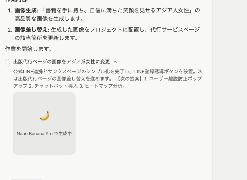 さらに、単に画像を作るだけではありません。生成した画像を自動的にプロジェクトの最適な箇所へ配置し、代行サービスページの該当箇所を更新する「画像差し替え」作業まで自律的に行います。この一気通貫のフローこそが、Manusの真骨頂です。