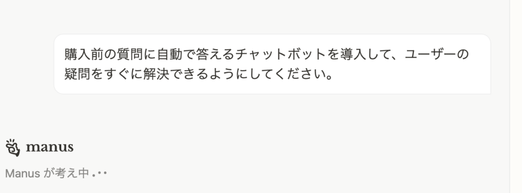 Manusは即座に「考え中」の状態に入り、解決策を構築し始めます。この「思考の速さ」と「実行の正確さ」の掛け合わせこそが、ビジネスを加速させる本物の力になります。